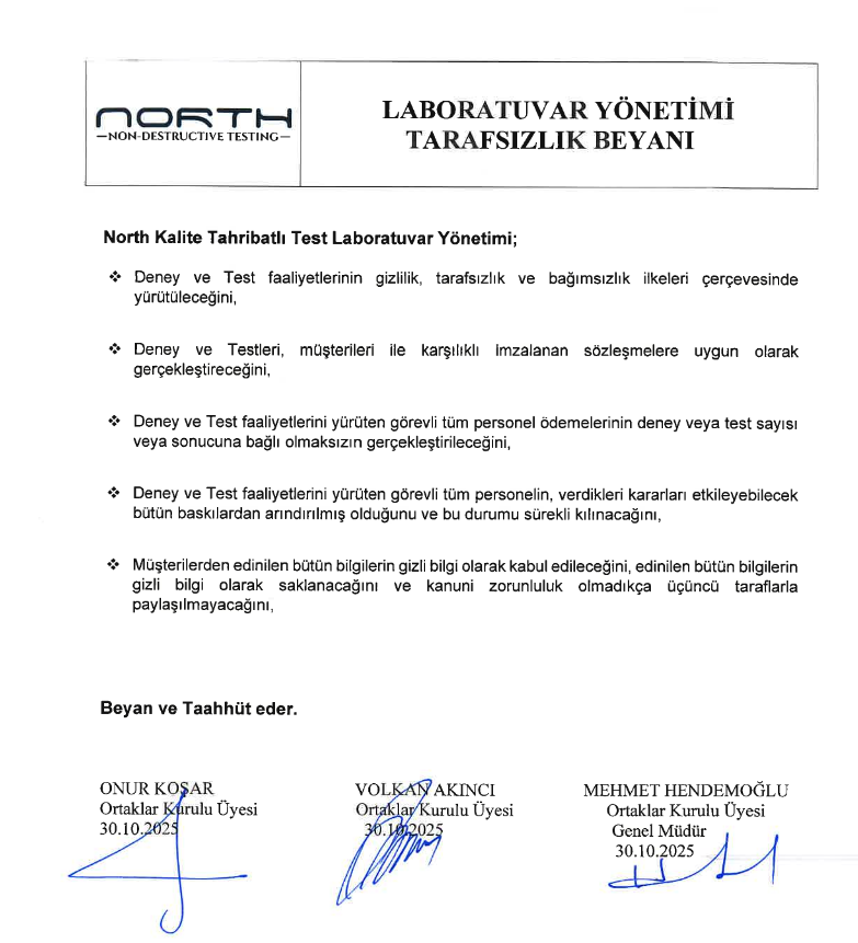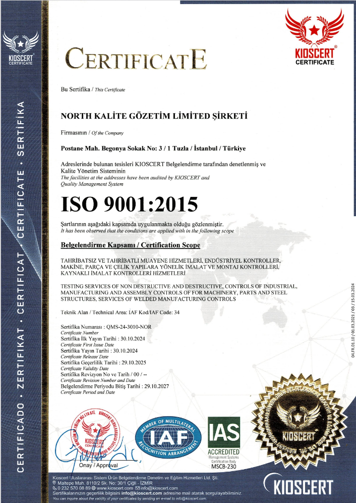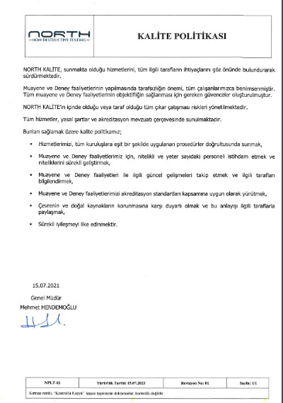 North Kalite Gözetim olarak 2018 yılından beri misyonumuz; Tahribatsız Muayene sektörünün lideri olarak müşterilerimize tüm Tahribatlı ve Tahribatsız hizmetleri en kaliteli olarak sağlamak, çözüm sunmaktır.