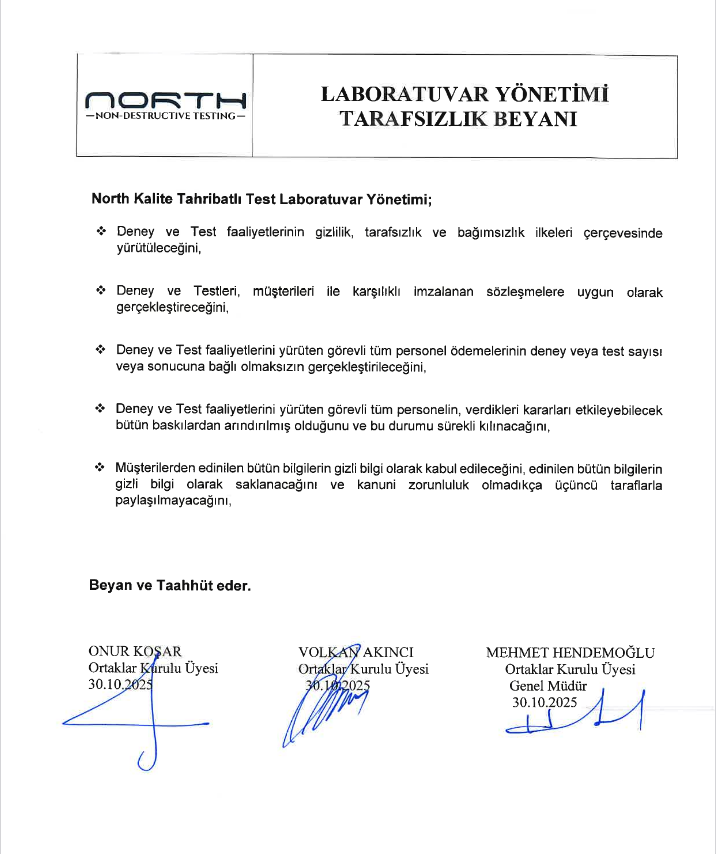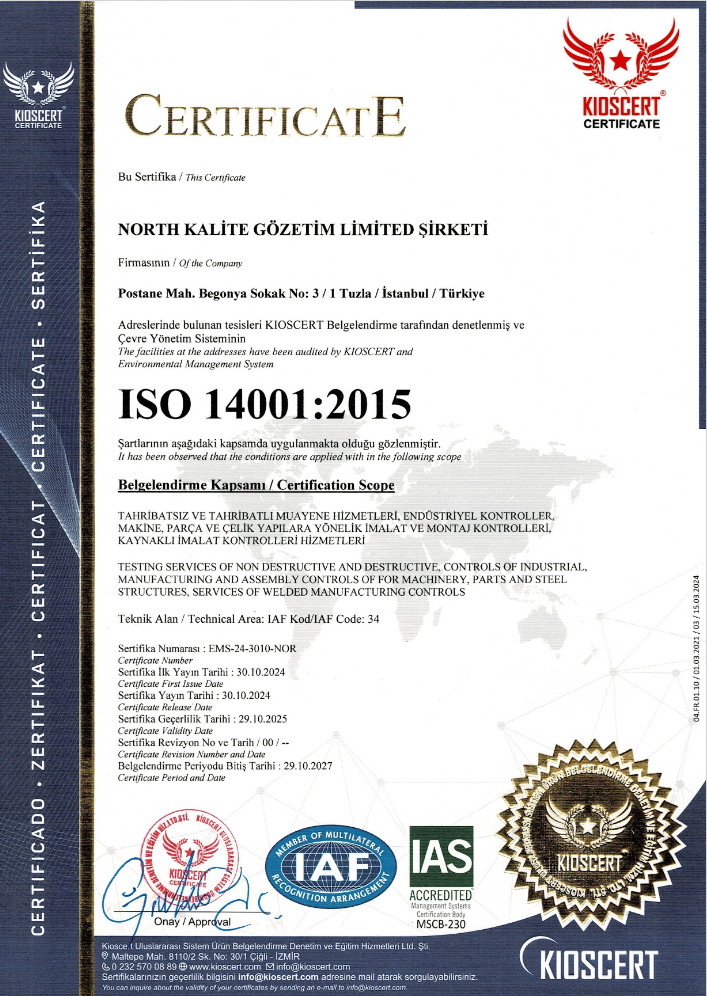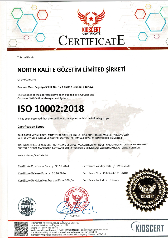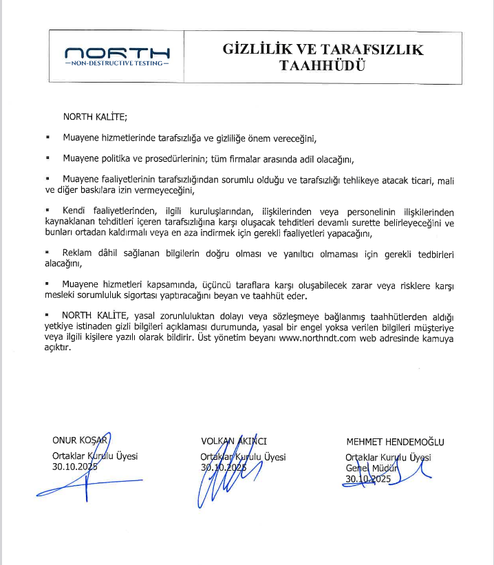 North Kalite Gözetim olarak 2018 yılından beri misyonumuz; Tahribatsız Muayene sektörünün lideri olarak müşterilerimize tüm Tahribatlı ve Tahribatsız hizmetleri en kaliteli olarak sağlamak, çözüm sunmaktır.